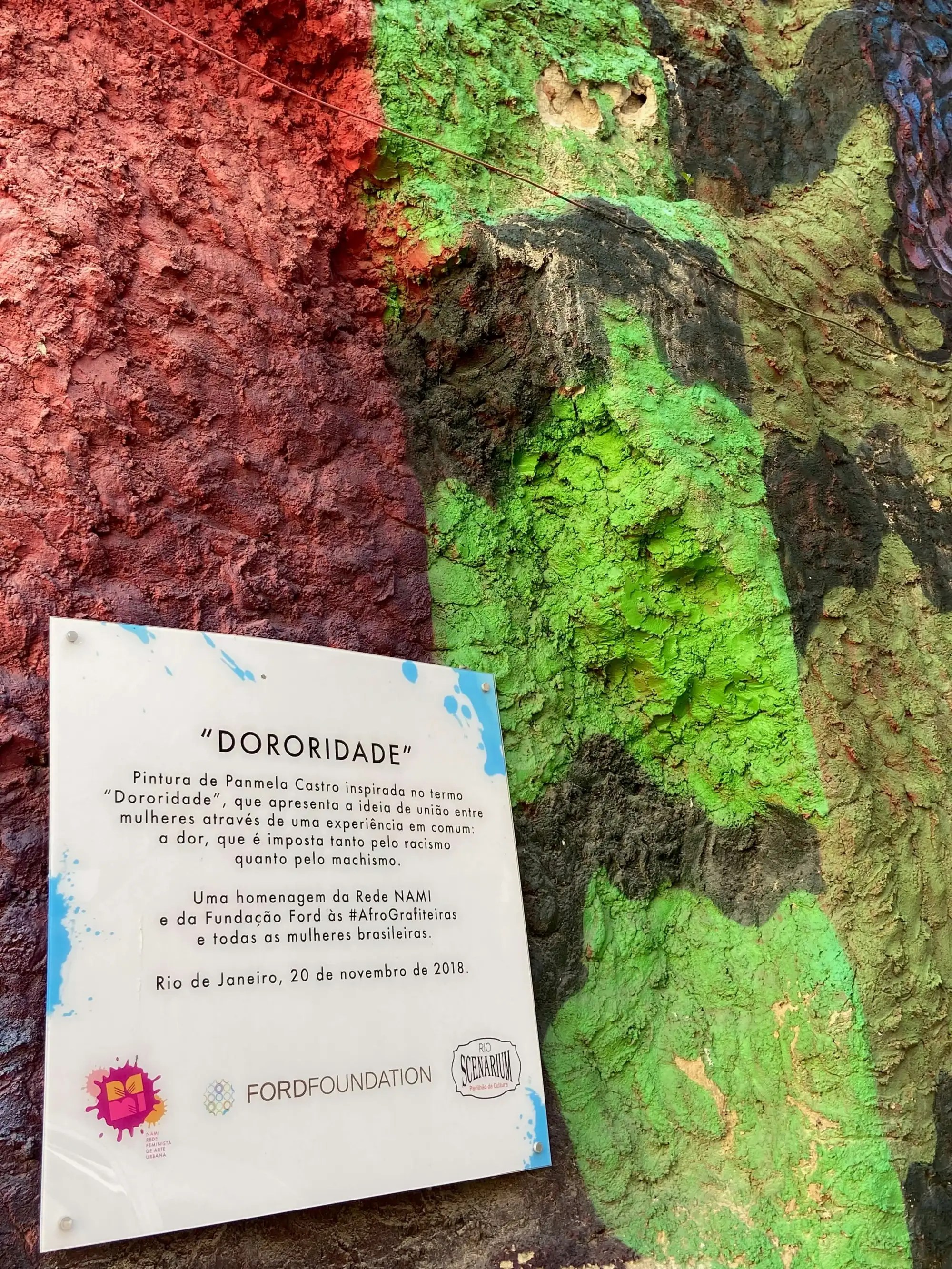 This incredible mural by Panmela Castro sits outside the women’s delegation in Rio, where I learned the neologism dororidade, which refers to unity amongst women as a result of shared pain produced by racism and/or sexism.