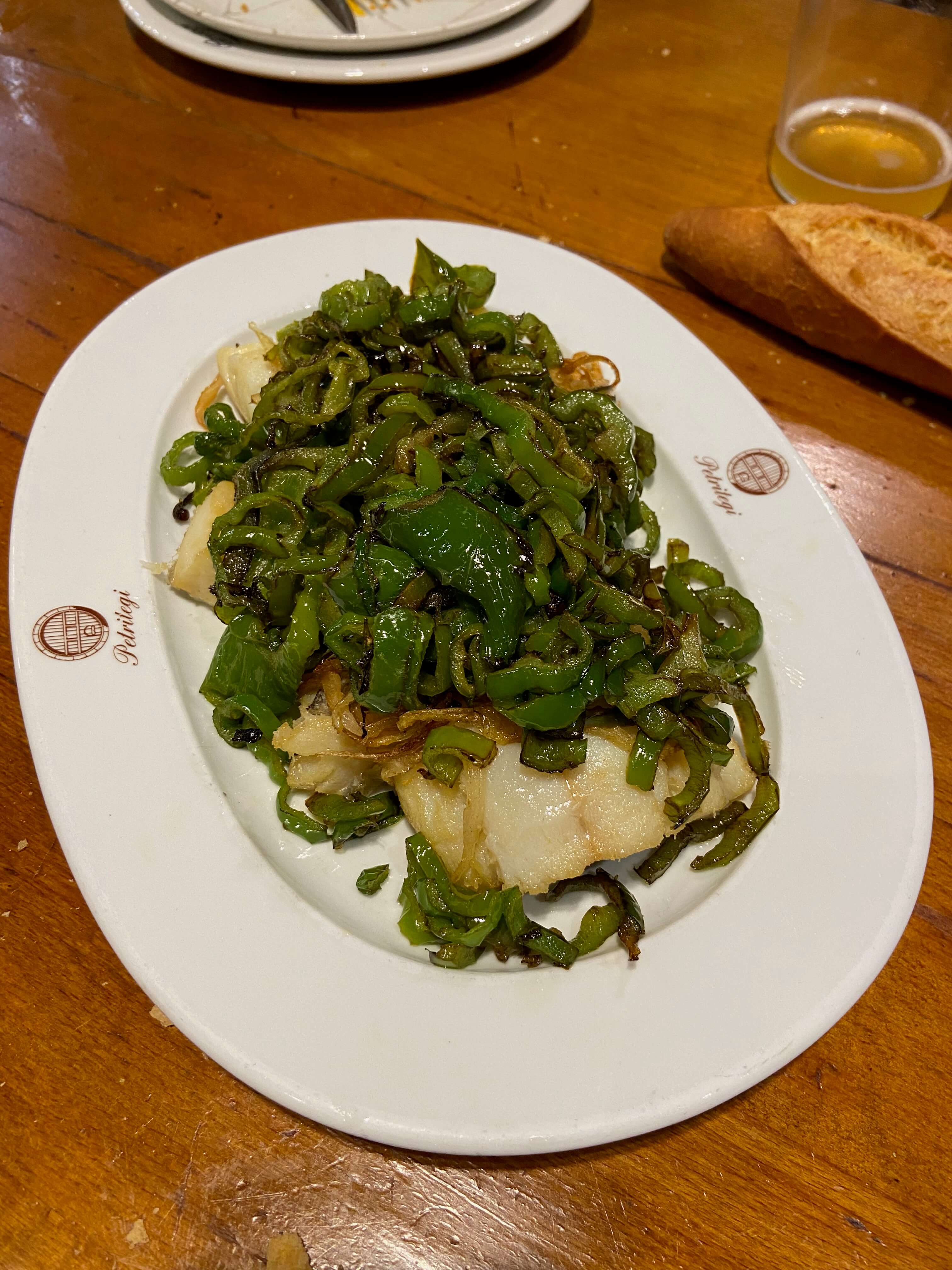 Cod: bacalao al pil-pil (garlicky sauce), bacalao con pimientos fritos (with fried peppers)